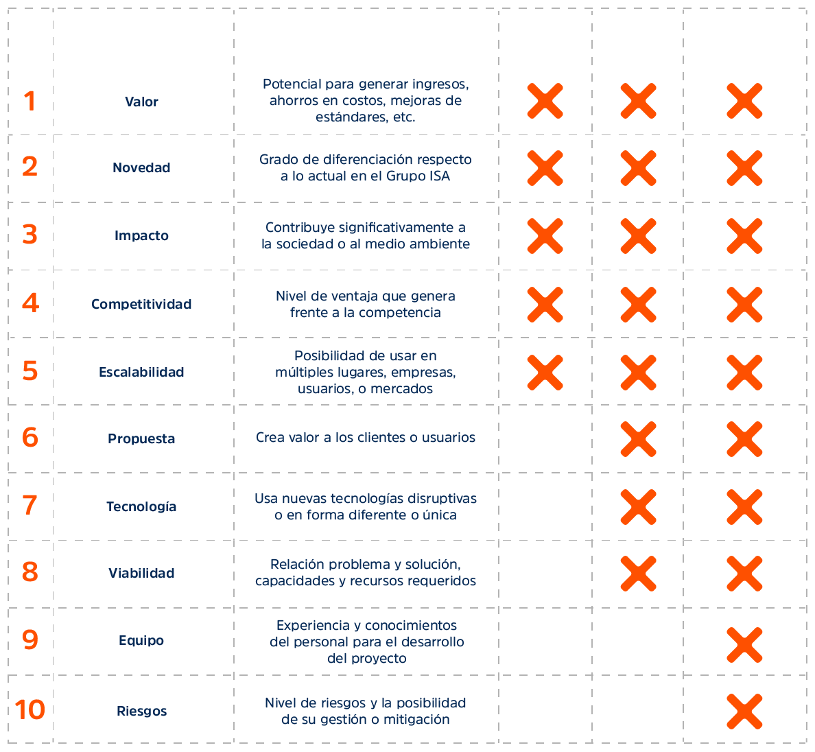 De acuerdo con las evaluaciones en el sistema, se escogerán las propuestas que mejor se ajusten a estos criterios, mayor calificación promedio, para continuar el proceso tanto a nivel interno entre las empresas del Grupo ISA como a nivel externo en el ecosistema de innovación abierta.