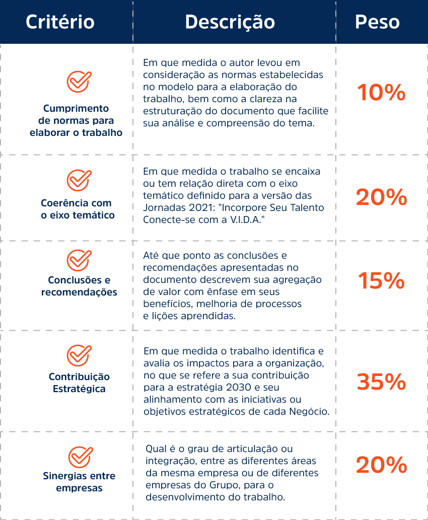 Os seguintes critérios e procedimentos devem ser aplicados pelos jurados, com o intuito de selecionar os melhores trabalhos nas diferentes etapas, e desta forma, garantir a qualidade do concurso das Jornadas do Conhecimento e Inovação 2021.